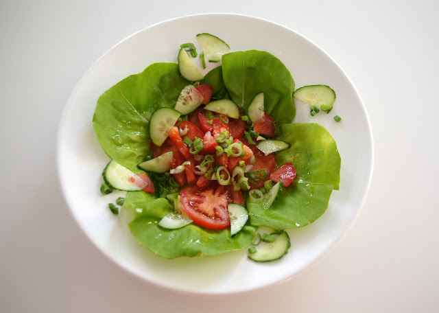 tomaattikuutioita. Leikkaa mukaan kurkkua puolikuuviipaleina.