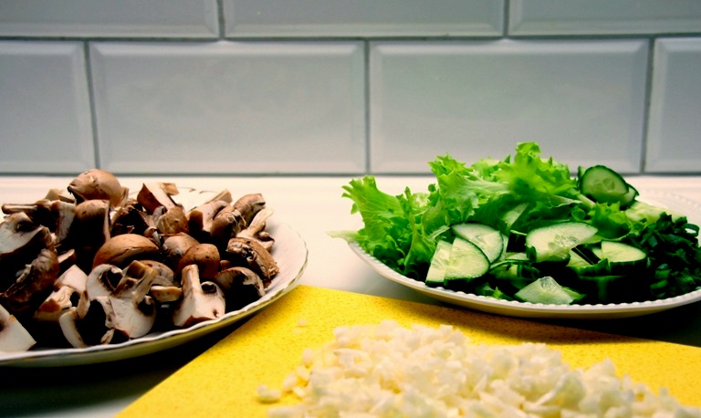 Kuvatuksi päätyivät myös lohkotut herkkusienet ja sipulisilppu,